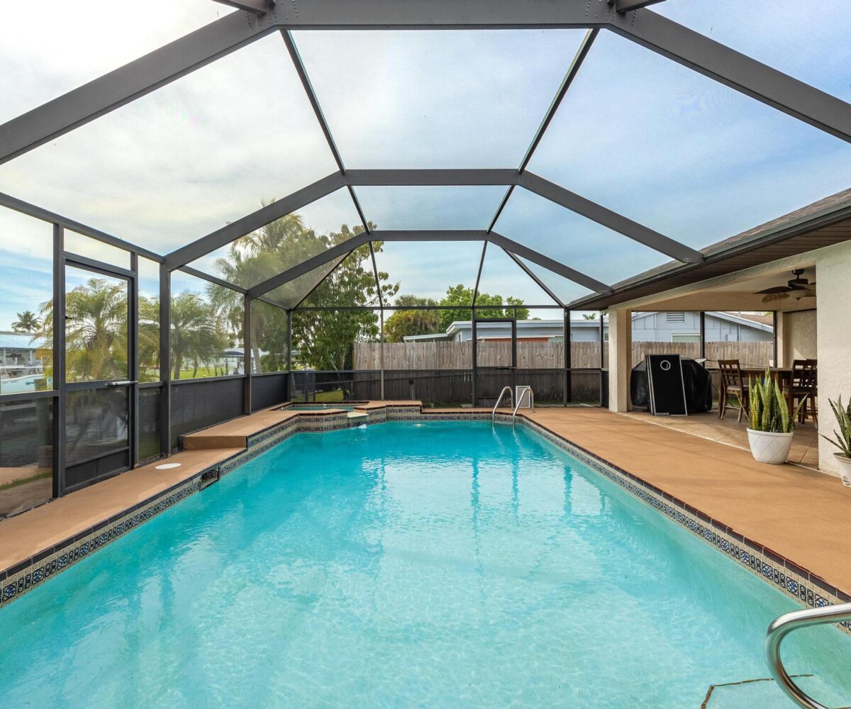 ** Huge Price Improvement ** Welcome to your waterfront retreat in the heart of North Fort Myers located in a Cul De Sac with a heated pool/spa and 10 mins to the Gulf with NO BRIDGES! The property has a New Roof 2023, Freshly painted inside and out 2023, new pump for irrigation 2022, A/C 2013(home) A/C 2023 (garage) UV Light 2023, Dock freshly painted/sealed 2024, and Pool Heater 2017. This property offers the perfect blend of convenience and waterfront living, with easy access to shopping, dining, and the serene waters of the Caloosahatchee River and the Gulf of Mexico. Step into a haven of relaxation with a sprawling outdoor area cover lani that is 22ft wide also boasting a large screened heated pool and spa area, ideal for entertaining or simply unwinding against the picturesque backdrop of the water with an outdoor kitchen area. Inside, discover a meticulously designed home, featuring an open floor plan that seamlessly connects the living, dining, kitchen areas, and a second family room. With three bedrooms that all have walk in closets and two bathrooms, including a luxurious master suite with serene water views, this home provides ample space for comfortable living. Prepare gourmet meals in the well-appointed kitchen, complete with all appliances, Tiled Counter Tops, and a pool/waterfront view. Boating enthusiasts will delight in the expansive boat dock that is 90ft long that has electricity and water connected to the dock, while offering direct access to the Caloosahatchee River and the Gulf of Mexico for endless aquatic adventures. Outside there is a fenced in dog run for all of your furry friends to play with ample space and also a mango tree. Plus, the over sized air-conditioned garage and additional storage room with A/C as well provide plenty of space for vehicles and belongings. Don’t miss the opportunity to experience waterfront living at its finest in this North Fort Myers gem. Contact me today to schedule a private tour and make this dream home your reality!